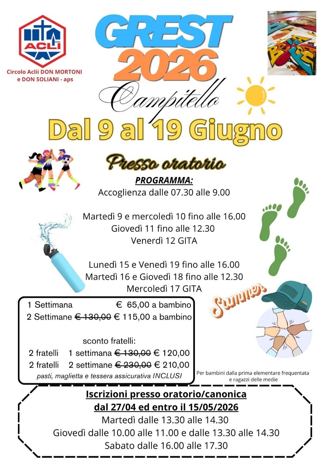 Dal 9 al 19 giugno si svolgerà il Grest presso l'Oratorio di Campitello, aperto a tutti i bambini e ragazzi della nostra Unità Pastorale.