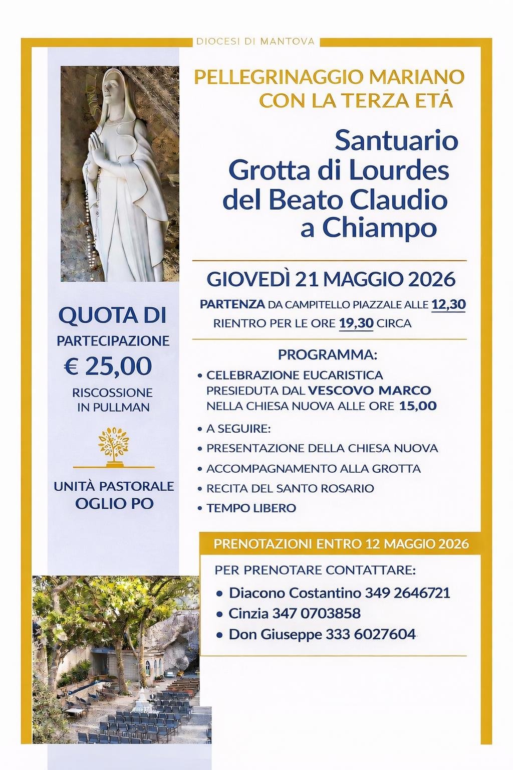 La Diocesi di Mantova propone un pellegrinaggio mariano rivolto alla terza età che si svolgerà giovedì 21 maggio al Santuario Grotta di Lourdes del Beato Claudio a Chiampo (VI).